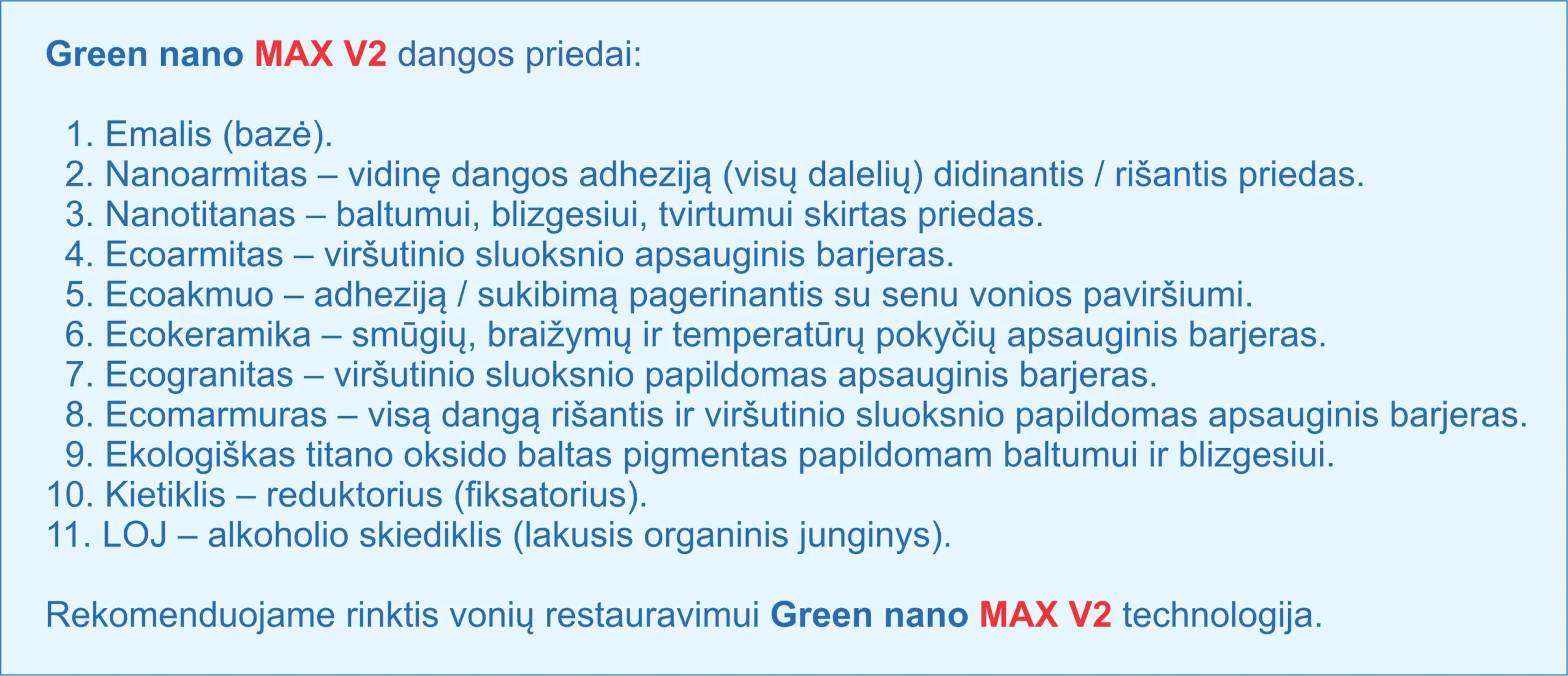 Vonios restauravimas – vonios atnaujinimas kliento namuose (vonios patalpoje), panaudojant dangą kurios pavadinimas (prekinis ženklas) Green nano MAX™ 2 versija. Tai super stipri danga, kurios pagrindinis stiprinantis kompozitas yra „nanoarmito – stiklo – keramikos” užpildas, danga taip pat papildomai turi ir „nano-titano” priedą dangos baltumui, blizgesiui ir papildomam tvirtumui. Danga liejama ant restauruojamo vonios paviršiaus wet-on-wet technologiniu būdu (šlapias ant šlapio) su turbina per 4-5 val. nesukeliant į aplinką dulkių. Po atlikto vonios restauravimo gamybinis kvapas visiškai pranyksta praėjus vos 30-40 min. Dangos džiuvimo laikas apie 12 val., o naudotis vonia po atlikto vonios restauravimo galima praėjus vos 24 val. Labai ilgas dangos natūralus nusidėvėjimas iki 20 metų ir ilgiau, tai priklausys nuo vonios naudojimo ir jos priežiūros. Suteikiama garantija NERIBOTAM laikui, tai ypatingas pasiūlymas, skambinkite sužinosite daugiau. šaltinis – www.vonios-restauravimas.lt